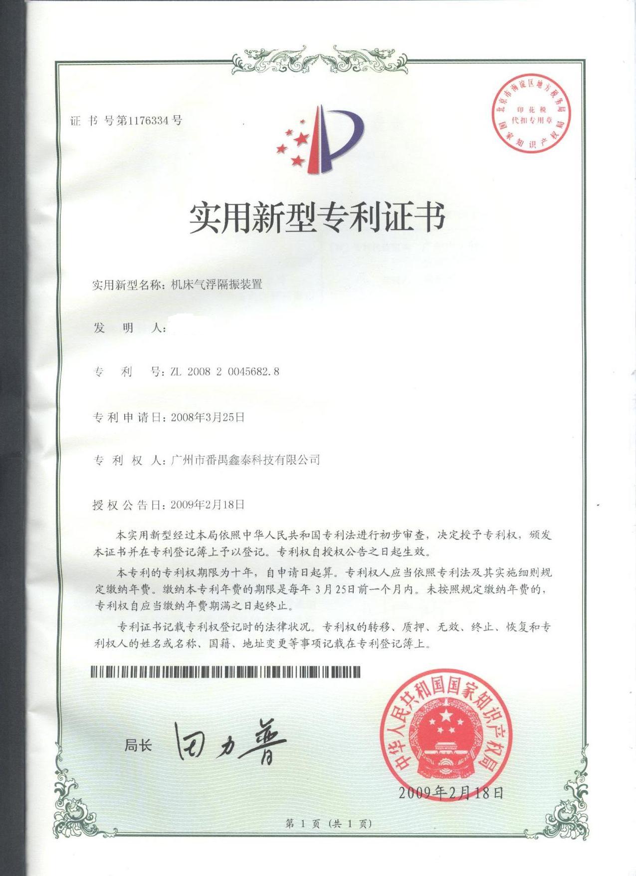 經過公司技術部門員工的辛勤努力,鑫泰集團獲得“機床氣浮隔振裝置”的實用新型專利