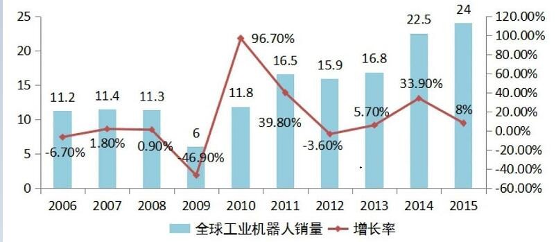 當(dāng)前全球機器人市場規(guī)模不斷擴(kuò)大,我國機器人產(chǎn)業(yè)發(fā)展勢頭迅猛,2015年國產(chǎn)自主品牌工業(yè)機器人占我國市場份額首次突破30%,未來機器人需求潛力巨大,當(dāng)前是機器人產(chǎn)業(yè)蓬勃發(fā)展的關(guān)鍵機遇期,要抓住機遇,發(fā)展壯大自主品牌,全面提升我國機器人產(chǎn)業(yè)核心競爭力。 據(jù)國際機器人聯(lián)合會統(tǒng)計,全球機器人市場規(guī)模不斷擴(kuò)大,2015年全球工業(yè)機器人銷量超過24萬臺,同比增長8%。2006-2015年,全球工業(yè)機器人銷量年均增速約為14%。2014年亞洲銷量約占2/3,中國、韓國、日本、美國和德國五大市場的銷量占全球工業(yè)機器人總銷量的75%左右。近十年全球工業(yè)機器人銷量見圖1所示。2014年全球?qū)S梅⻊?wù)機器人銷量為2.4萬臺,較2013年同比增長11.5%;銷售額達(dá)到37.7億美元,較2013年同比增長3%。2014年,全球個人/家用服務(wù)機器人銷量約為470萬臺,較2013年同比增長28%;銷售額達(dá)到22億美元。鑫泰數(shù)控加工中心機器人龍門