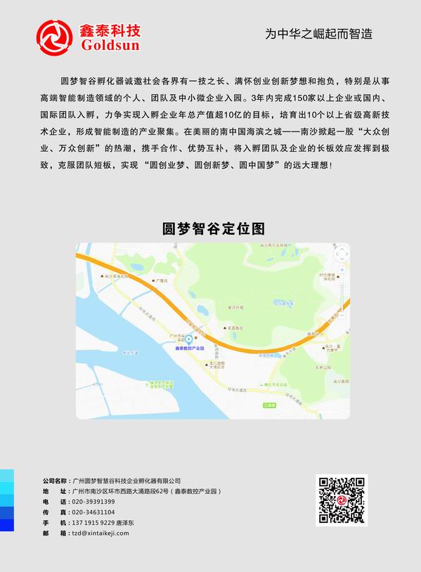 圓夢智谷孵化器是廣東鑫泰科技集團投資建設(shè),面向智能制造的專業(yè)孵化器,位于廣州 市南沙區(qū)鑫泰數(shù)控產(chǎn)業(yè)園,孵化場地總面積2萬平方米,園區(qū)環(huán)境優(yōu)美,基礎(chǔ)設(shè)施完善。 圓夢智谷孵化器借力母公司在智能制造特別是機器人領(lǐng)域的技術(shù)優(yōu)勢、產(chǎn)業(yè)優(yōu)勢,利用 自有產(chǎn)業(yè)園,憑借“核聚變創(chuàng)業(yè)創(chuàng)新,打造中國智造新生態(tài)”的理念,提供智能制造領(lǐng)域?qū)?業(yè)孵化服務(wù),打造面向智能制造產(chǎn)業(yè)的高科技孵化器和國際投資合作平臺,吸引全球智能制 造的高端人才、資金、項目進駐,并提供中試基地和設(shè)備、技術(shù)服務(wù)、檢驗檢測服務(wù)、供應(yīng) 鏈管理、市場推廣、法律、財務(wù)、產(chǎn)業(yè)投資、融資、政策扶持、后勤管理等服務(wù)。為有夢 想、有能力、想創(chuàng)業(yè)的人才提供智能制造領(lǐng)域創(chuàng)業(yè)、創(chuàng)新孵化服務(wù),充分克服短板效應(yīng),發(fā) 揮長板效應(yīng),助推成長! 圓夢智谷孵化器目前已有三+多個智能制造產(chǎn)業(yè)鏈項目入園孵化,包括人工智能、軟件 編程、精密加工、各種機器人、機器人控制系統(tǒng)、數(shù)控智能設(shè)備、大數(shù)據(jù)與信息化項目等。 我們總結(jié)并創(chuàng)新了一套在智能制造行業(yè)發(fā)展的獨特思路和模式,以擁有核心技術(shù)的智能制造 領(lǐng)先企業(yè)為主導(dǎo),以國際智能制造產(chǎn)業(yè)鏈集群協(xié)同合作為主線,以資本孵化為推動力,以園 區(qū)產(chǎn)業(yè)技術(shù)和國際合作平臺為資源,以阿米巴模式實現(xiàn)自主經(jīng)營管理和發(fā)展,實現(xiàn)各個項目 的裂變、聚變和核聚變,打造機器人等智能裝備產(chǎn)業(yè)的國際合作平臺,孵化助推智能制造領(lǐng) 域的中小微企業(yè)成長,創(chuàng)新驅(qū)動,最終實現(xiàn)智造產(chǎn)業(yè)鏈新生態(tài)。 孵化器以市場為導(dǎo)向,以政策為助推,以技術(shù)為支撐,提供全產(chǎn)業(yè)鏈服務(wù),堅持先進制 造技術(shù)的發(fā)展方向,以高端裝備、工業(yè)機器人與智能化制造、互聯(lián)網(wǎng)信息化等企業(yè)為服務(wù)對 象,按“創(chuàng)業(yè)導(dǎo)師+核心技術(shù)支撐+產(chǎn)業(yè)鏈整合+中試生產(chǎn)檢驗平臺支持+天使投資”的運營方 式,打造集群化孵化服務(wù)平臺和共享環(huán)境,降低創(chuàng)業(yè)企業(yè)的創(chuàng)業(yè)風(fēng)險和創(chuàng)業(yè)成本,提高創(chuàng)業(yè) 團隊的成活率和成功率。 眾智、眾創(chuàng)、共享、生態(tài),形成聚變,加上資本運營的力量,實現(xiàn)核聚變。為中國智能 制造的中小微企業(yè)提供孵化服務(wù),助推成長,打造中國智造新生態(tài),是我們的追求!為中華 之崛起而智造,是我們的使命!